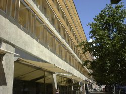 1998年8月17日 ストックホルム市内 日除けのためのオーニング。 断熱性能の良い外断熱の建物では、夏の日射の進入をいかに遮るかが重要。
