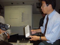 2002年9月10日 STOミュンヘンにおけるプレゼンテーション 透明断熱材を紹介する上田仁司さん