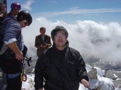 2004年8月22日 標高2,962mのツークシュピッツェ山頂に立つ堀内,後ろに見えるのは田中辰明博士