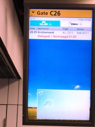 2008年5月30日 ノルウェーへの旅 オランダ スキポール空港の案内板 21:05 遅れてクリスチャンセンへ出発