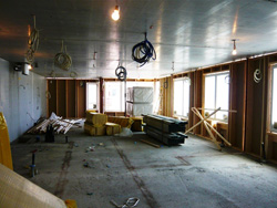 2008年6月22日 スウェーデン ストックホルム ハンマビーショースタッドに建設中(工事中)のマンション室内 木造住宅と同じように、外壁に断熱材を充填後、室内側に防湿シートを施工する 外壁は床スラブ、鉄骨柱の熱橋対策を兼ねた外張り断熱(外断熱)